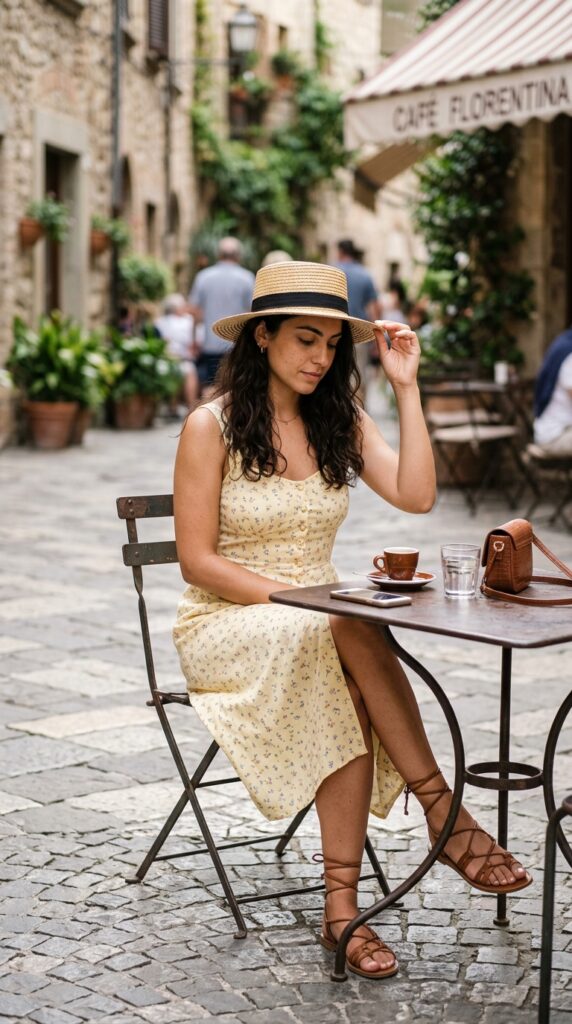 A soft pastel sundress paired with a structured straw hat creates that classic vacation aesthetic. Add lace-up sandals, a mini bag, and subtle jewelry for a feminine summer resort style.