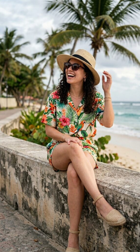 Go bold with a tropical print two-piece set featuring a relaxed button-up shirt and matching shorts. Add espadrilles, a wide-brim hat, and tinted sunglasses for a playful yet put-together tropical vacation outfit.