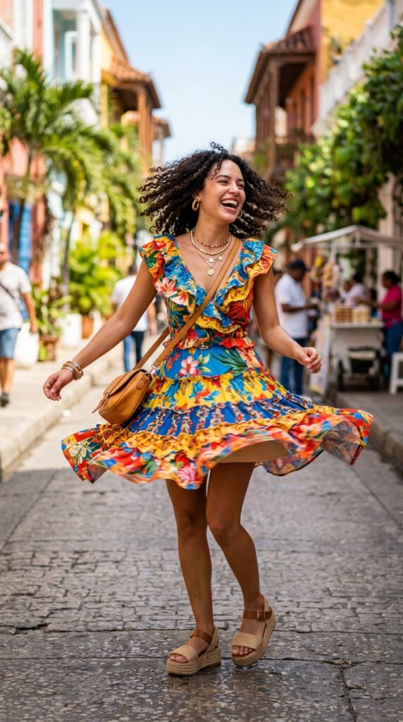 A ruffled mini dress in a vibrant shade brings playful energy to your look. Style with platform sandals, layered necklaces, and a crossbody bag for a fun tropical vacation outfit.