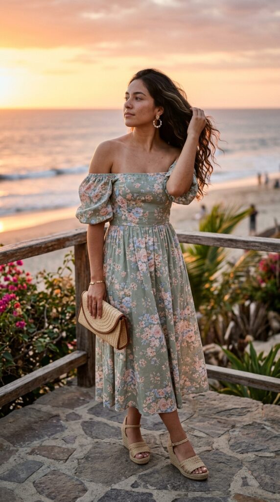 An off-shoulder midi dress in a soft floral or pastel shade feels romantic and breathable. Style with wedge sandals, statement earrings, and a clutch for a sunset dinner-ready Mexico beach outfit.