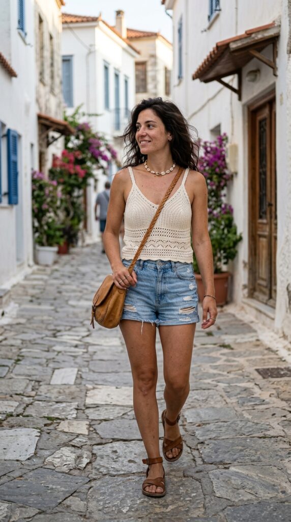 Pair a handmade-style crochet top with distressed denim shorts for a laid-back boho feel. Add ankle sandals, shell jewelry, and a crossbody bag—perfect for exploring coastal towns in style.