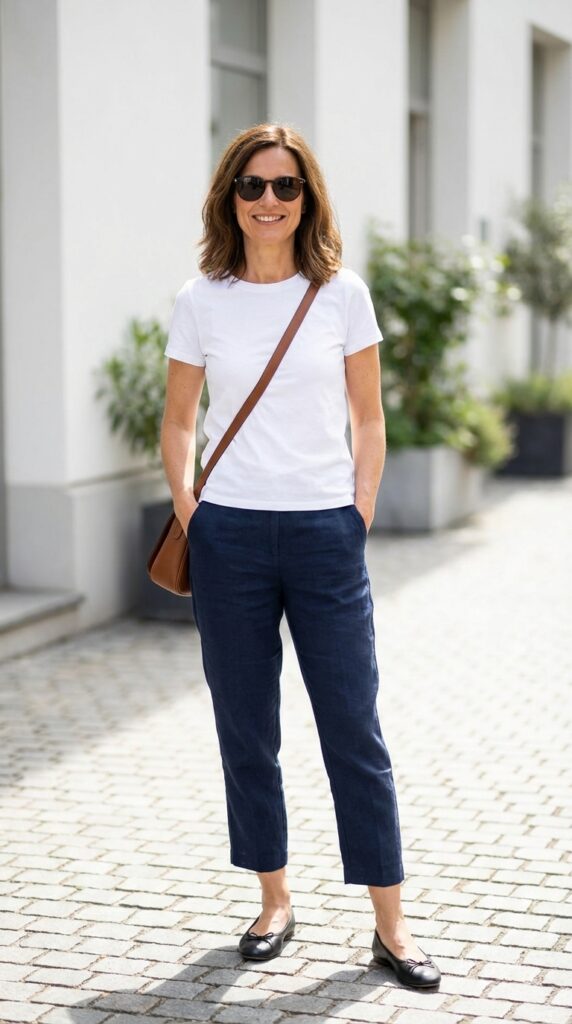 Keep it simple with a high-quality cotton tee and cropped trousers. Add ballet flats, a leather crossbody, and sunglasses for a timeless outfit that feels both modern and comfortable.