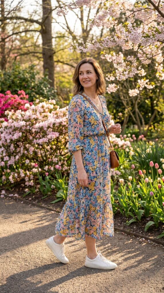 A lightweight midi dress in a soft print feels feminine yet practical. Pair it with classic white sneakers, a crossbody bag, and minimal jewelry for one of the easiest comfortable travel outfits over 40.