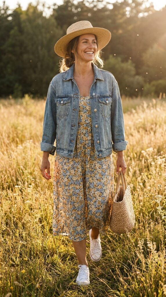 Layer a classic denim jacket over a soft sundress for versatility. Add white sneakers or flats and a straw hat for an easy outfit that works from morning exploring to evening dinners.