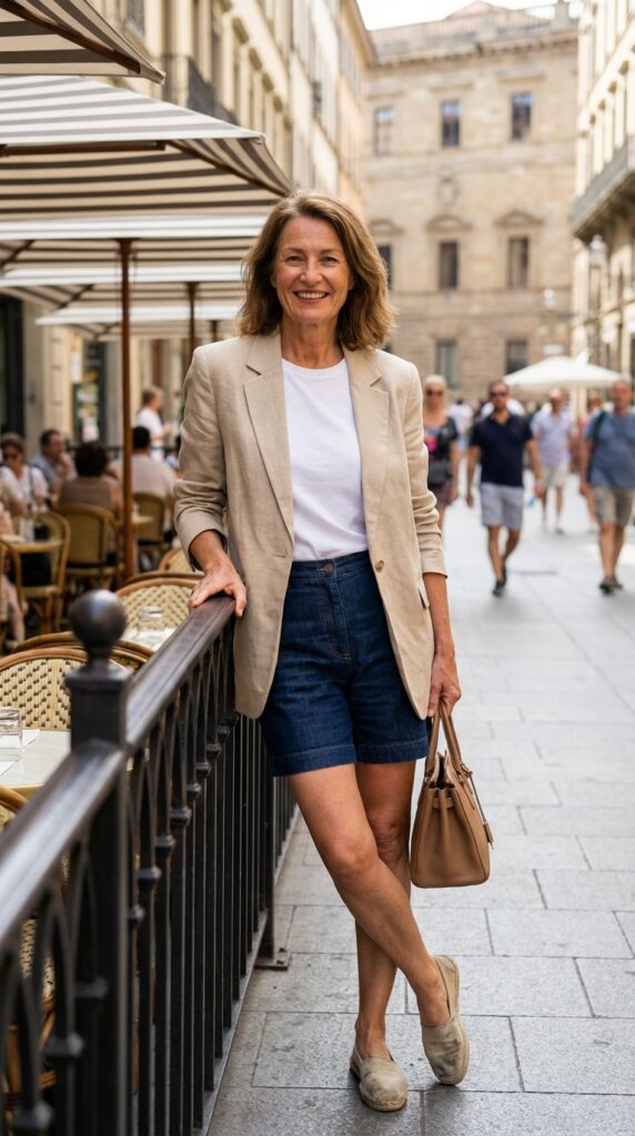 Balance structure and ease with a lightweight blazer over a basic tee and tailored denim shorts. Finish with loafers or espadrilles and a structured handbag for a smart-casual summer travel vibe.