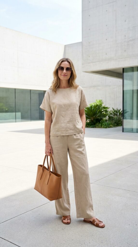 A coordinated linen set (top and pants or shorts) makes styling effortless. Pair with neutral sandals, a straw bag, and gold hoops for a refined outfit that fits perfectly into summer vacation outfits for women over 40.