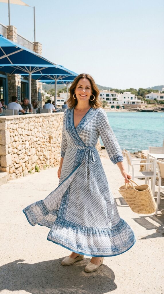 A wrap dress flatters every body type and is perfect for travel days. Style with espadrilles, a woven bag, and statement earrings for a feminine and easy-to-pack option.