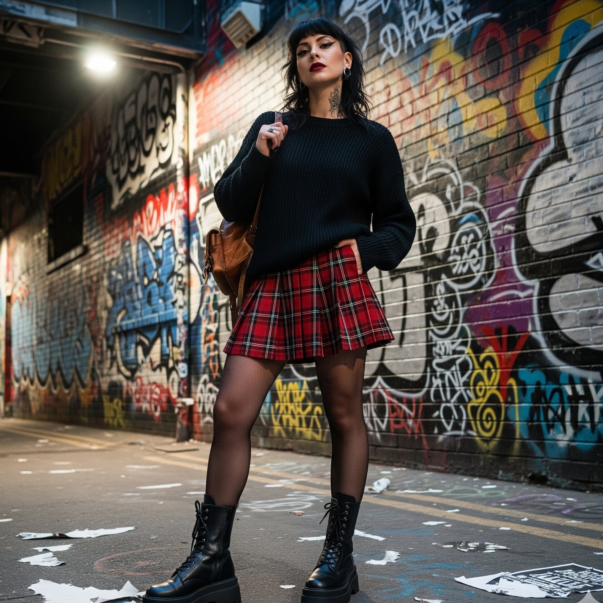 Add some edge with a plaid mini skirt styled with a black sweater. Combat boots give the outfit a trendy, rebellious touch.