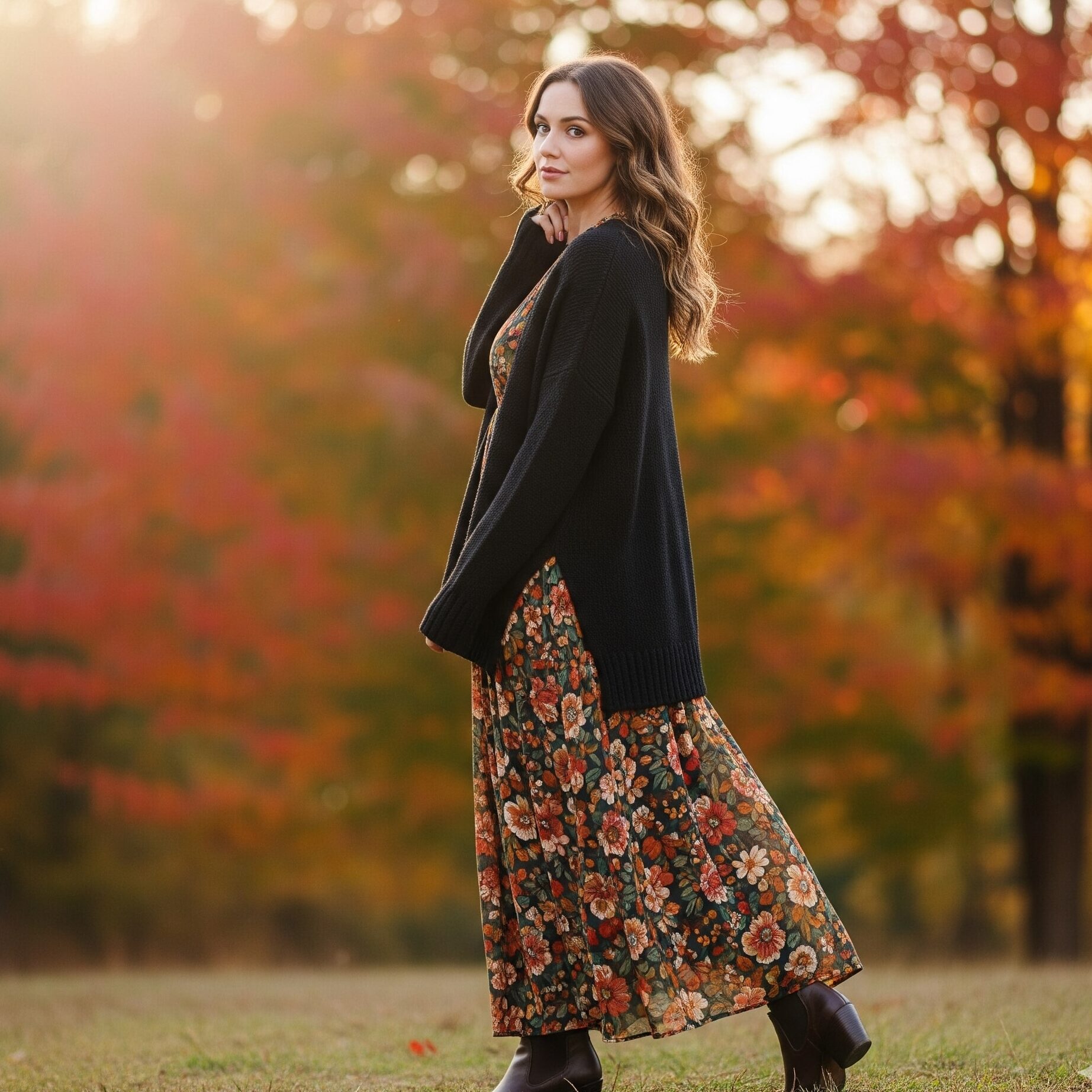 Layer a black sweater over a flowy maxi dress to create a boho-inspired fall outfit. Let the skirt peek through for cozy yet chic style.