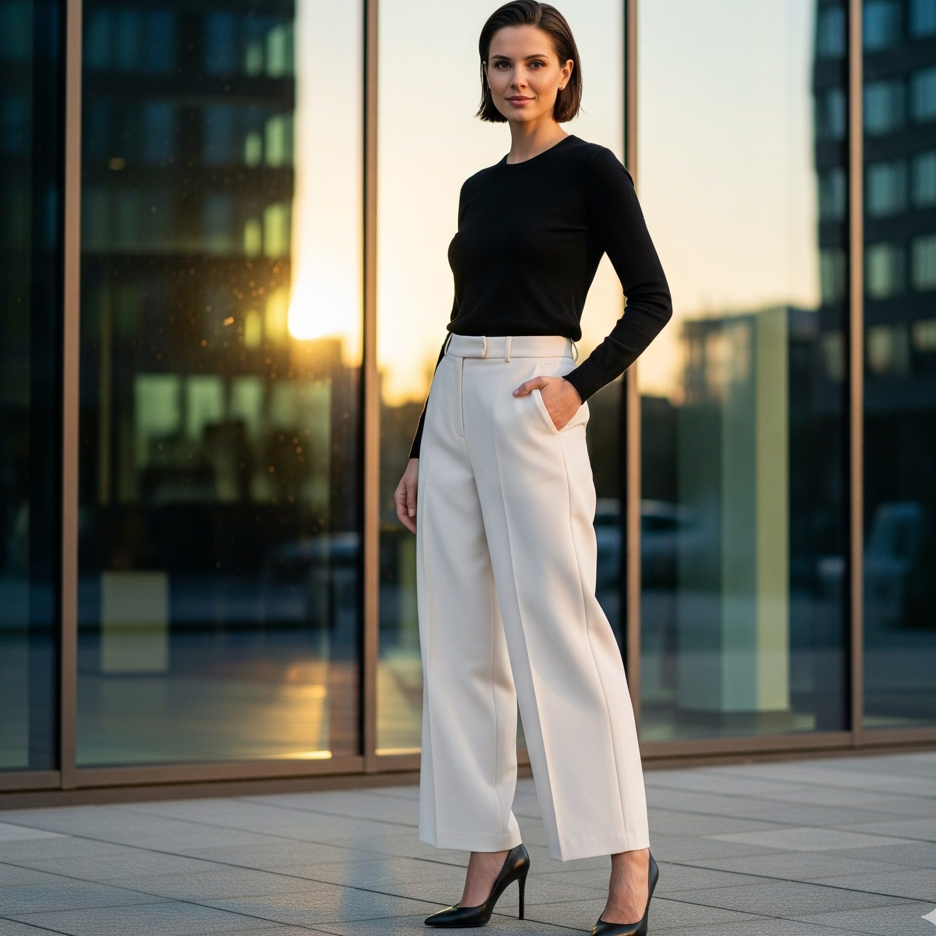 For an office-ready look, tuck a black sweater into wide-leg trousers. Pointed heels add height and elegance, making the outfit sleek and professional.