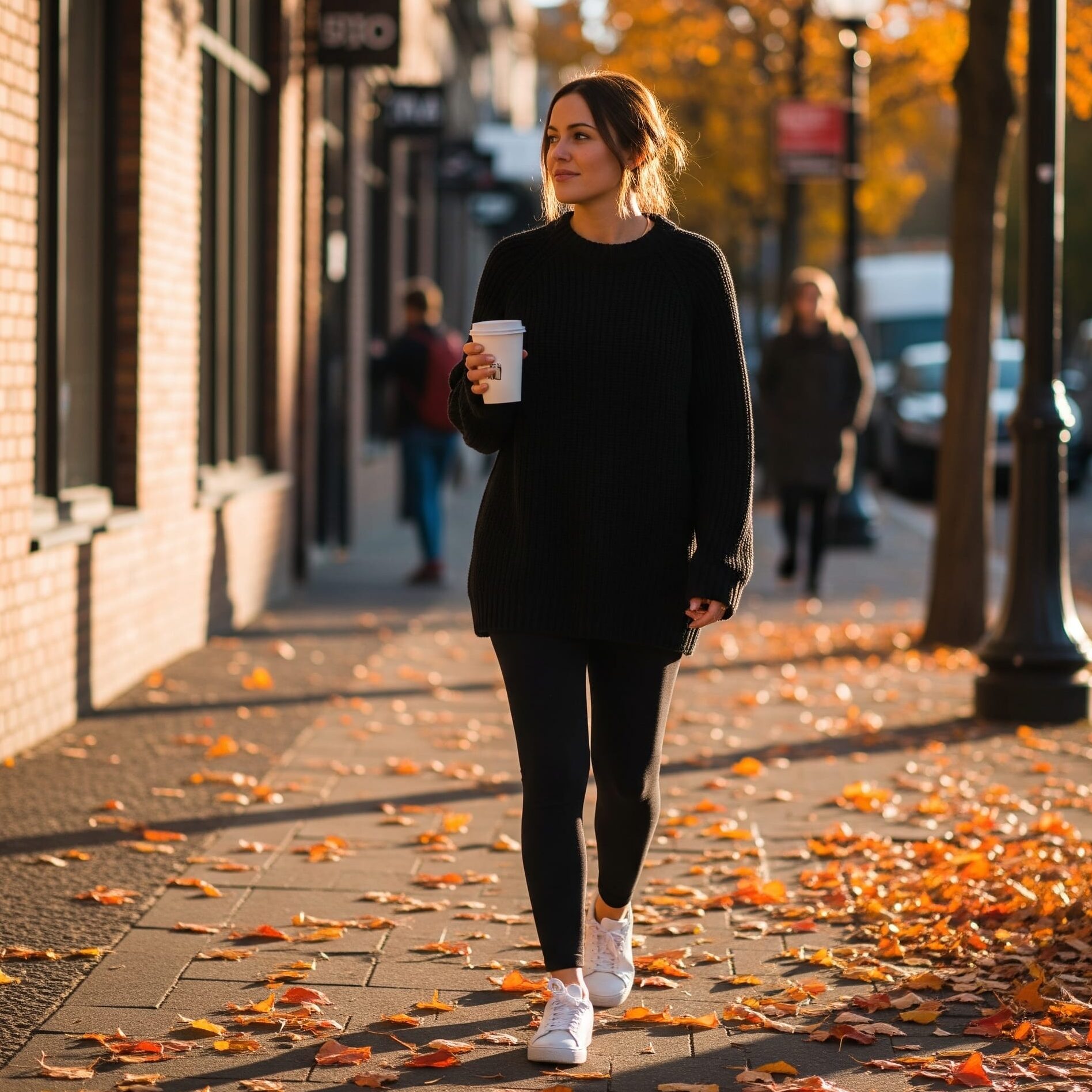For maximum comfort, wear an oversized sweater with leggings and white sneakers. It’s cozy, casual, and perfect for running errands or lounging.