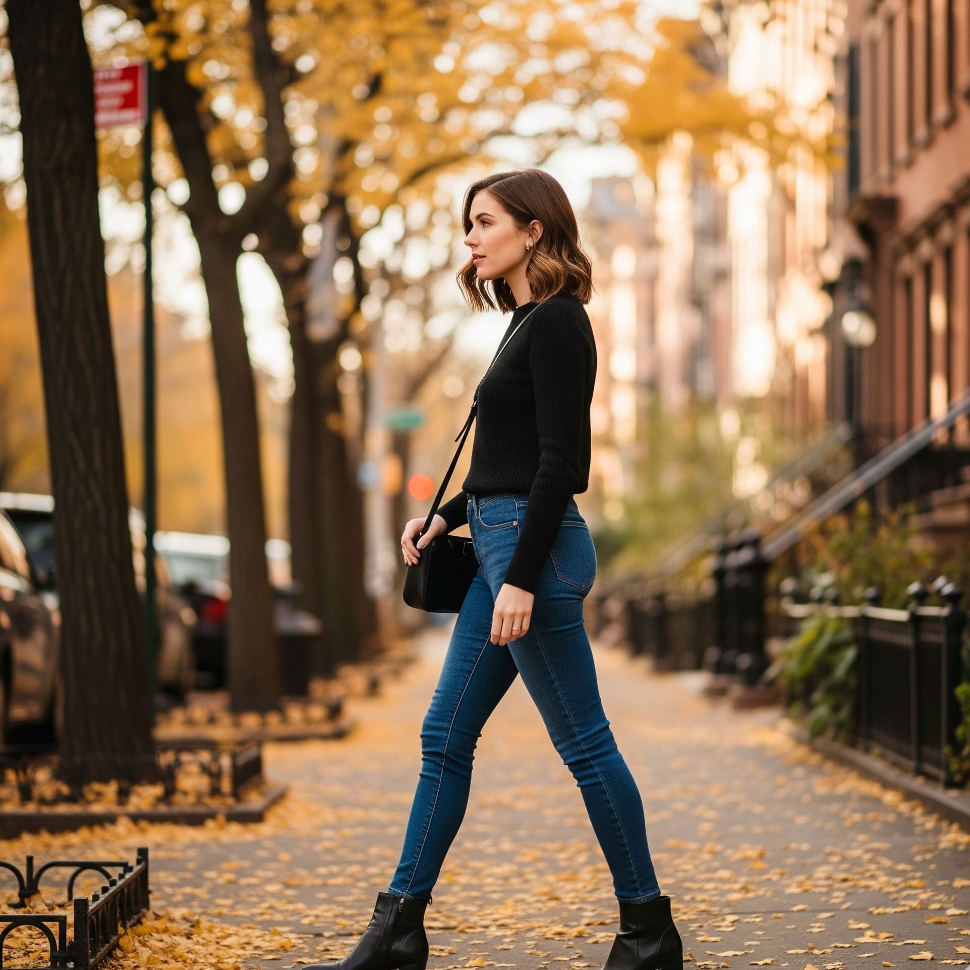 A classic fall combo—pair your black sweater with skinny jeans and sleek ankle boots for a timeless everyday look that always feels polished.