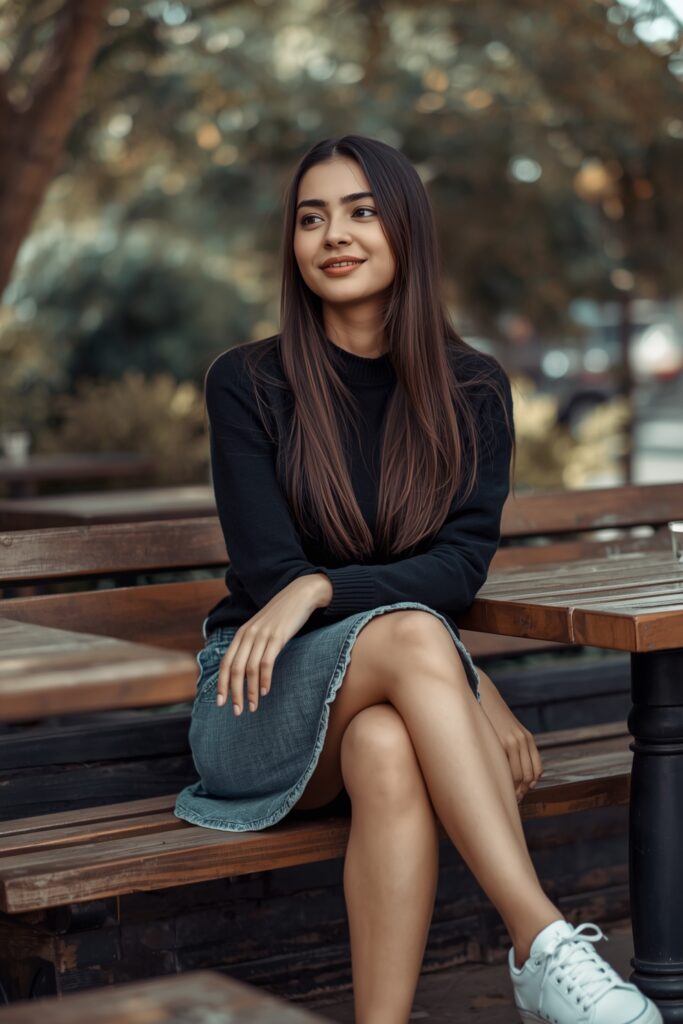 Keep it casual and playful with a denim skirt and black sweater. Add sneakers for a laid-back yet stylish weekend outfit.