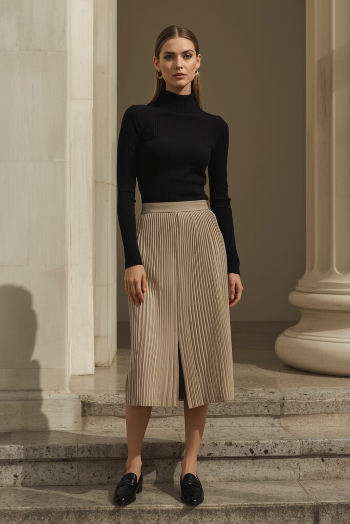 Elevate your style with a fitted turtleneck tucked into a flowy midi skirt. Add heeled boots for a feminine yet sophisticated vibe.