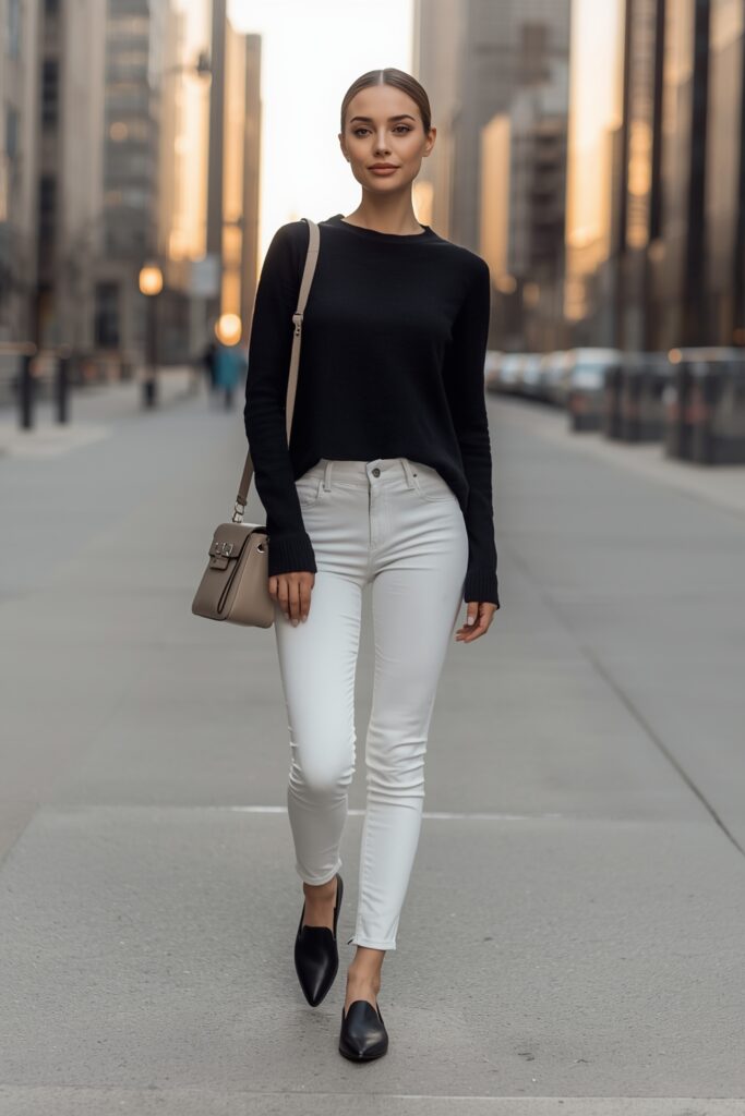 Switch up fall tones with a contrast look. A black sweater and white jeans paired with neutral flats feel fresh and modern.
