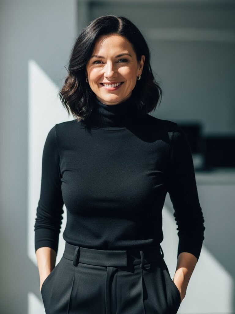 A fitted black turtleneck paired with tailored trousers creates a clean, sleek silhouette. This all black chic outfit feels polished and professional—perfect for minimalists who love classy all black outfits for women.