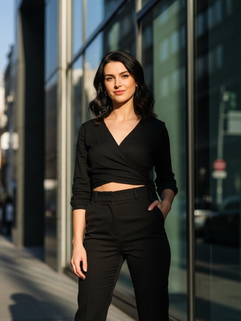 A black wrap top creates a flattering waistline, while cropped dress pants add a clean, tailored finish. This classy all black outfit is ideal for office days and after-work outings.