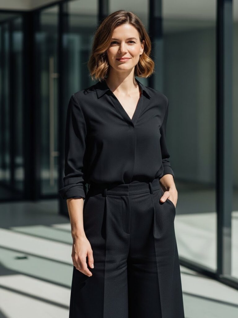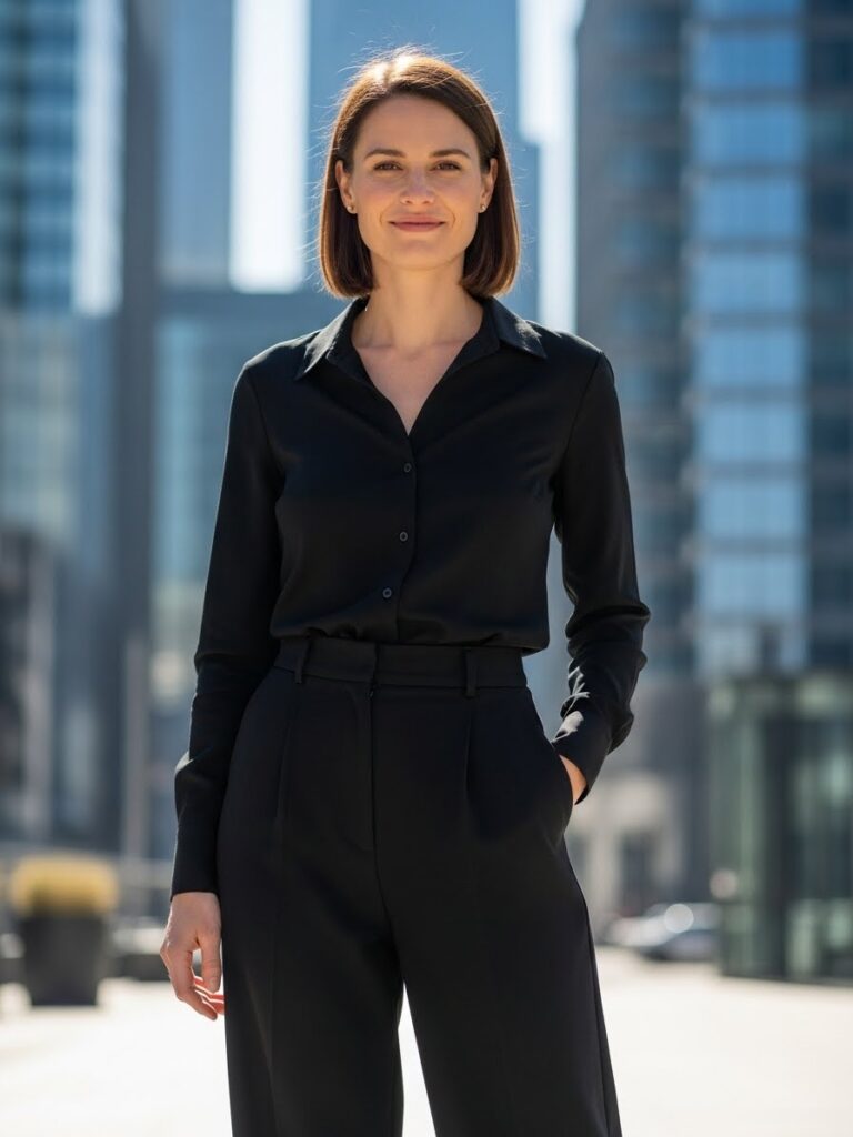 A crisp black button-up tucked into wide-leg trousers delivers a powerful, structured look. This is an all black professional outfit that works beautifully for meetings, presentations, or corporate environments.