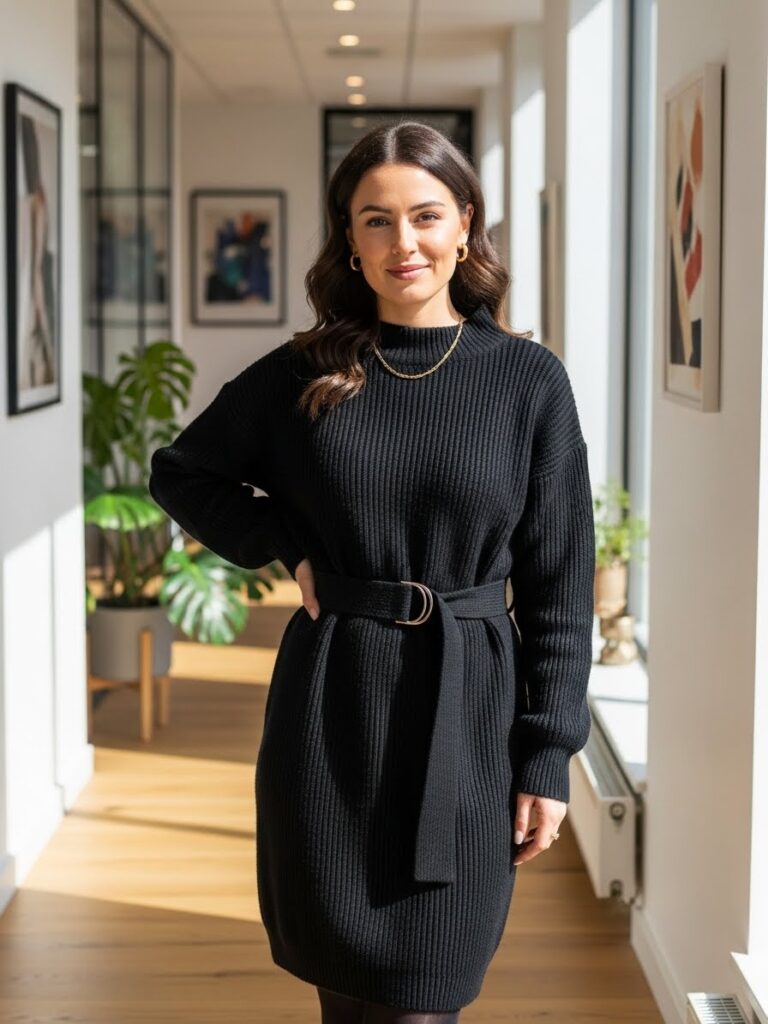 A belted black sweater dress creates shape and comfort. Add this to your rotation for a cozy yet professional all black outfit for women classy enough for any office.