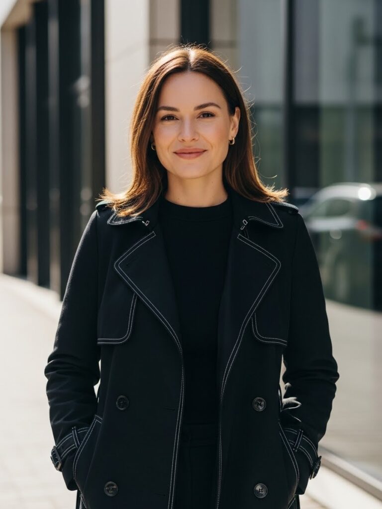 Layering a black trench coat over an all-black base instantly makes the outfit sleek and powerful. This is the perfect all black professional outfit for colder seasons.