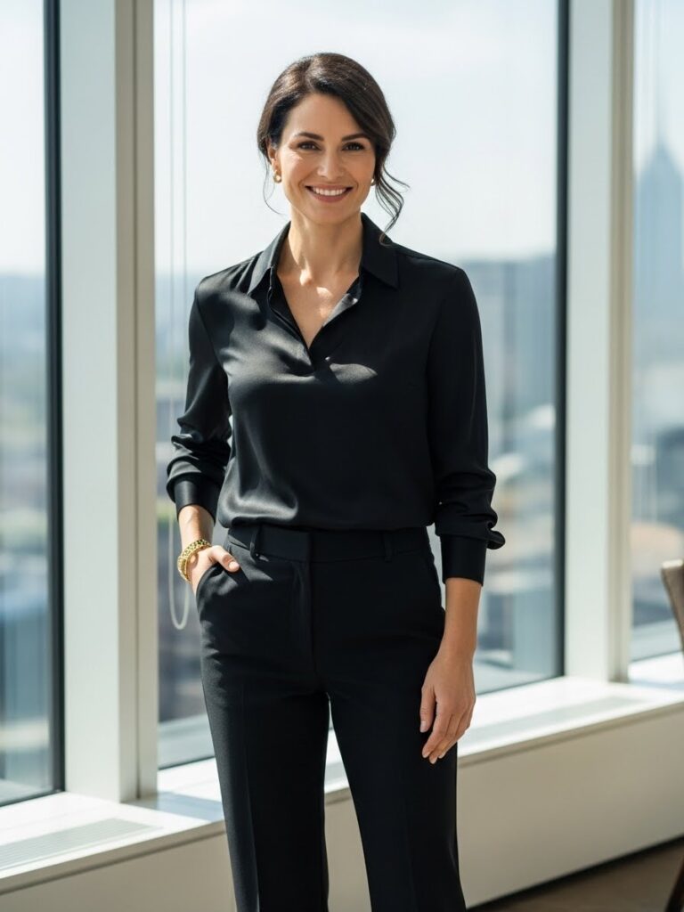 A black silk blouse adds subtle shine and elegance. Paired with straight-leg trousers, it becomes an all black chic outfit that feels both soft and structured—ideal for professional settings.