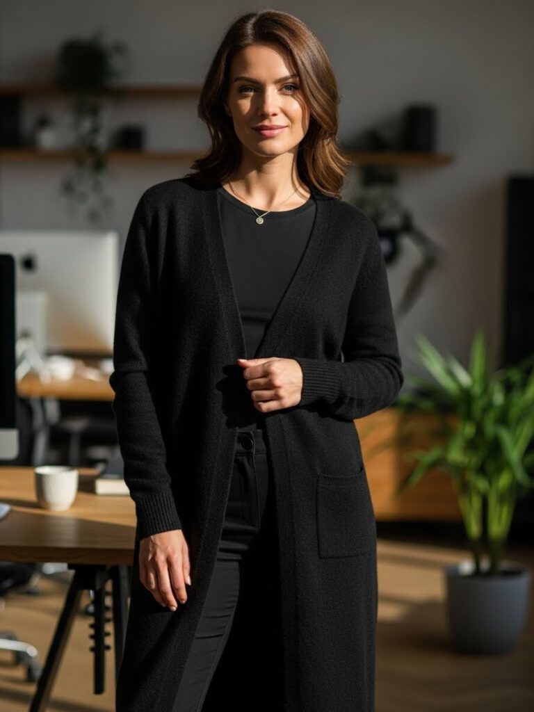 A longline cardigan layered over slim black pants is the perfect comfort-meets-style look. This all black outfit casual classy and perfect for women who love elevated everyday workwear.