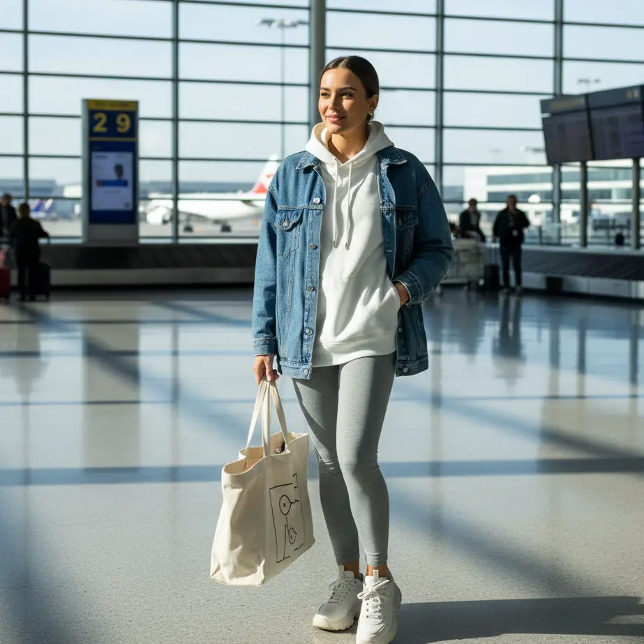Pair light gray leggings with a white oversized hoodie and chunky sneakers. Add a denim jacket and tote bag for a travel-ready vibe that screams chic and comfy — the ultimate lazy outfit for on-the-go days.