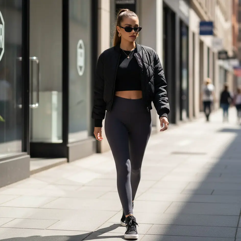 Mix gray leggings outfit casual energy with a black bomber jacket, fitted crop top, and high-top sneakers. Add sleek sunnies and small hoops for a photo-ready off-duty look.