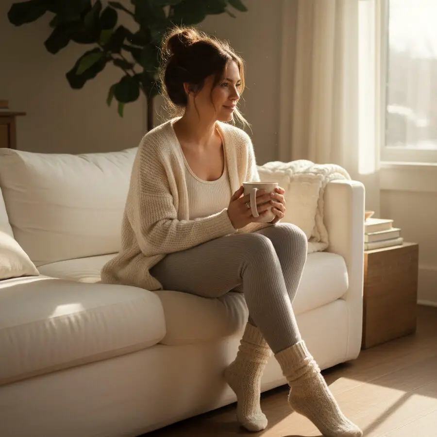 Slip into light gray leggings with a soft knit cardigan, ribbed tank, and cozy socks. Add a messy bun and your favorite mug — this is one of those cute lazy day outfits made for self-care Sundays.