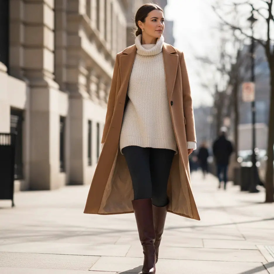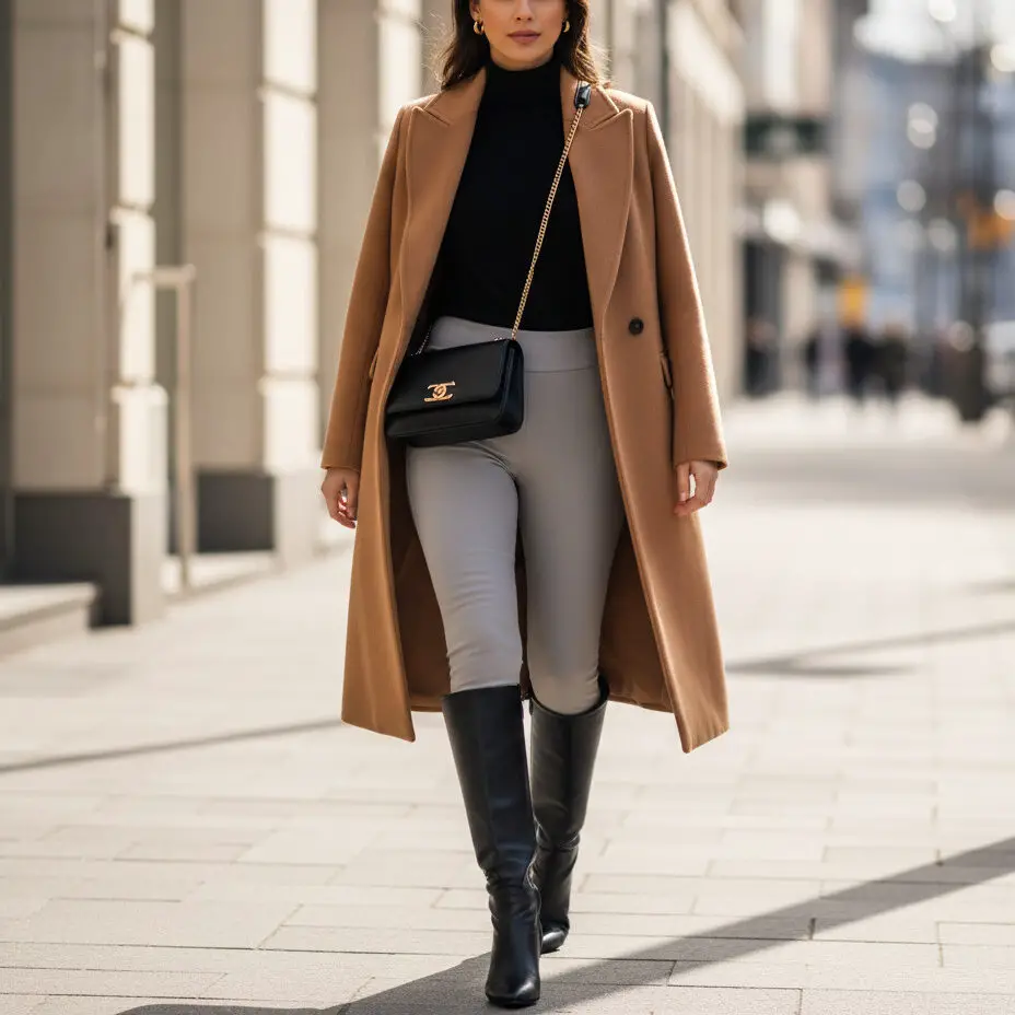 Rock your grey leggings outfit with an oversized cream turtleneck, long wool coat, and knee-high boots. Cozy, classy, and ideal for leggings outfits winter moments.
