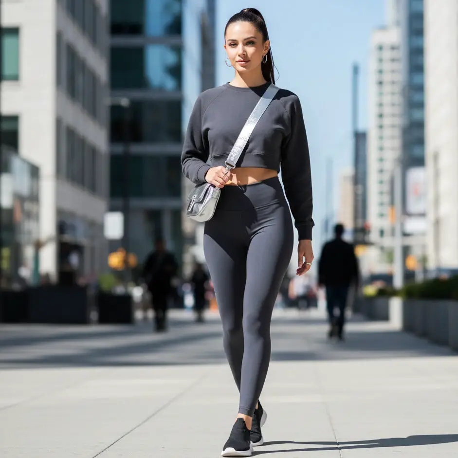 Go for a dark gray leggings outfit with a charcoal cropped sweatshirt and black trainers. Add a silver crossbody bag for a sleek street-style edge that transitions effortlessly from errands to brunch.