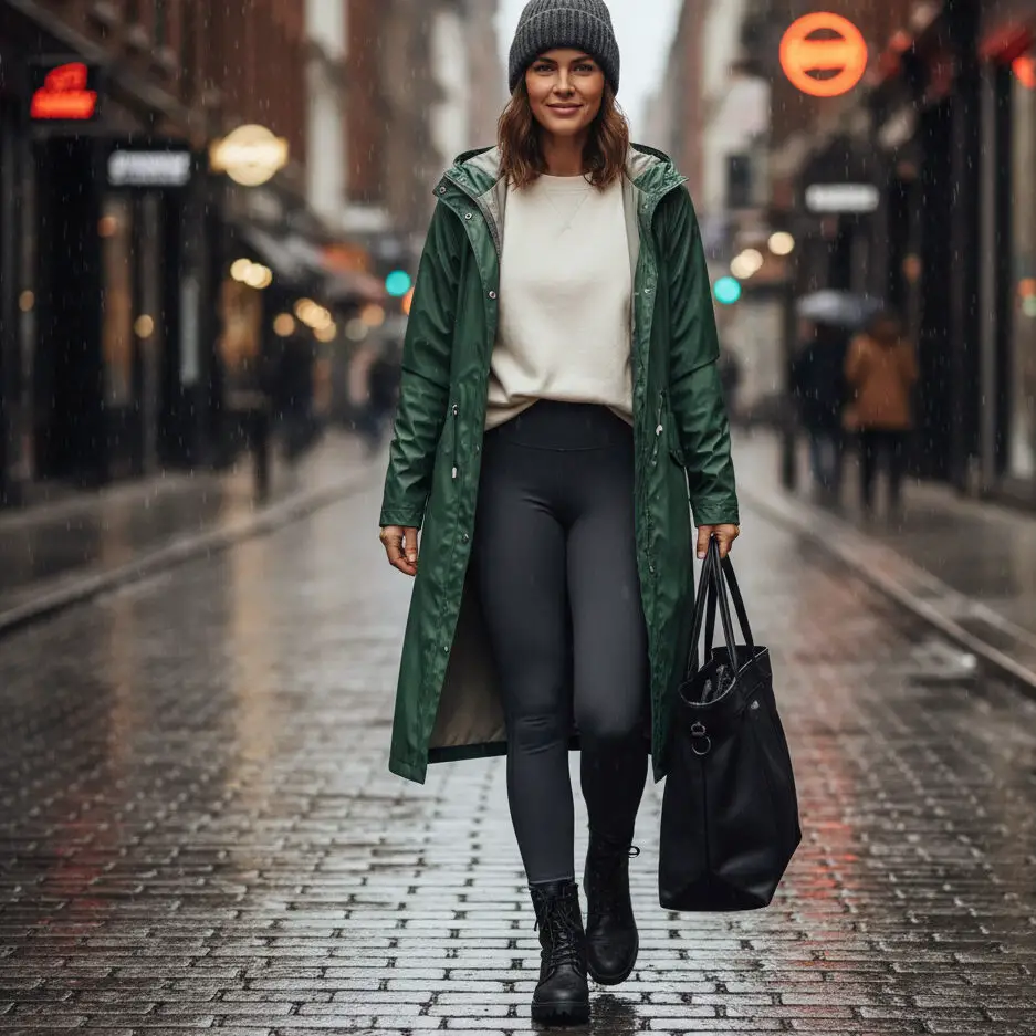 Opt for dark gray leggings outfit with an oversized sweatshirt, waterproof boots, and a longline raincoat. Add a beanie for a functional yet stylish lazy outfit option.