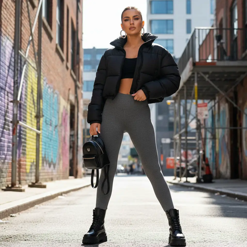 Try high-waisted grey leggings with a cropped puffer jacket, black sports bra, and combat boots. Add hoop earrings and a mini backpack for a black leggings outfits inspired urban twist.