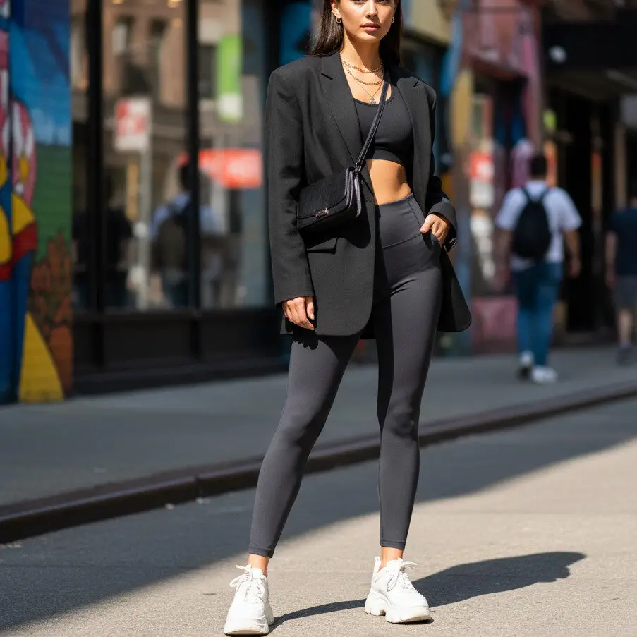 Style grey leggings with a sports bra, oversized blazer, and chunky sneakers. A confident blend of activewear and streetwear for when gym plans turn into brunch plans.