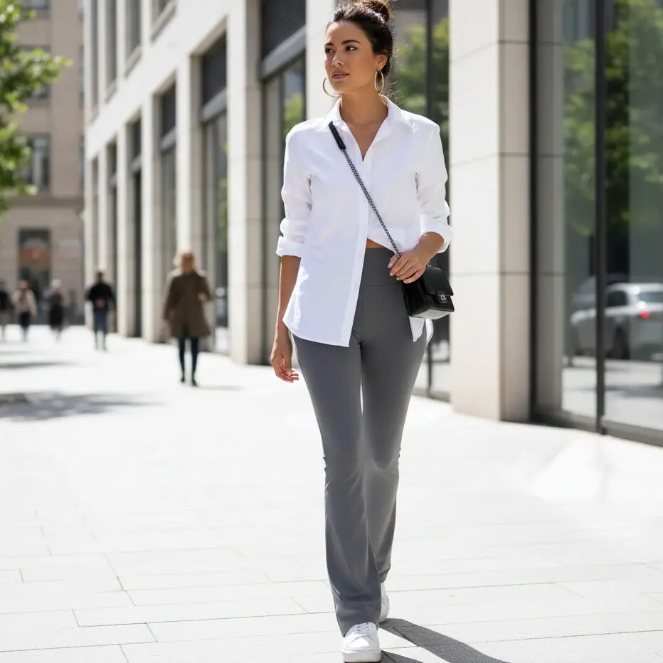 Wear grey flares outfit with a white button-up shirt half-tucked into leggings. Add platform sneakers and a crossbody bag for that minimalist influencer vibe.