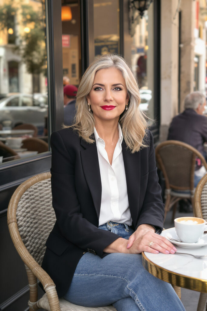 For city exploring, combine straight-leg jeans with a breathable blouse and a lightweight blazer. This look feels instantly polished and works beautifully for museums, cafés, or casual dinners.