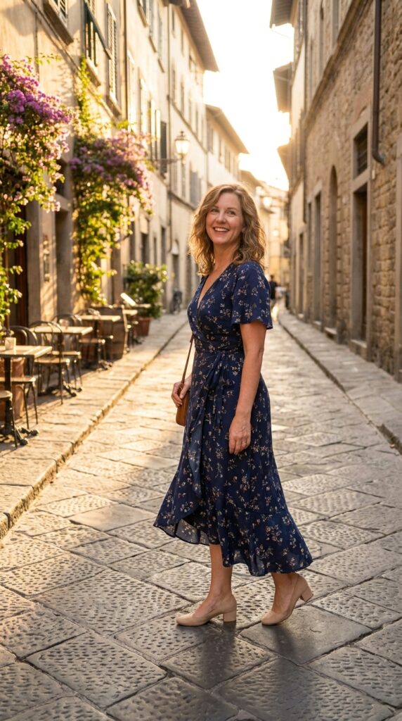 A flattering wrap dress is a must-have for Italy. It defines the waist beautifully and works for both day and evening. Pair it with low block heels or elegant sandals for a refined, feminine look.