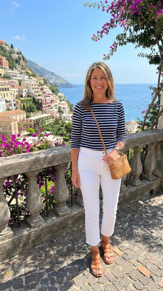 Channel that effortless coastal Italian style with white jeans and a classic striped top. Add tan sandals and a crossbody bag—simple, fresh, and perfect for seaside towns.