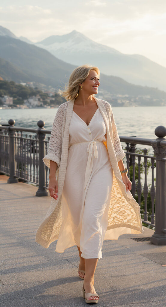 Layering is key, especially for cooler evenings. Throw a soft, lightweight cardigan over a simple summer dress for a cozy yet chic look that transitions easily from day to night.