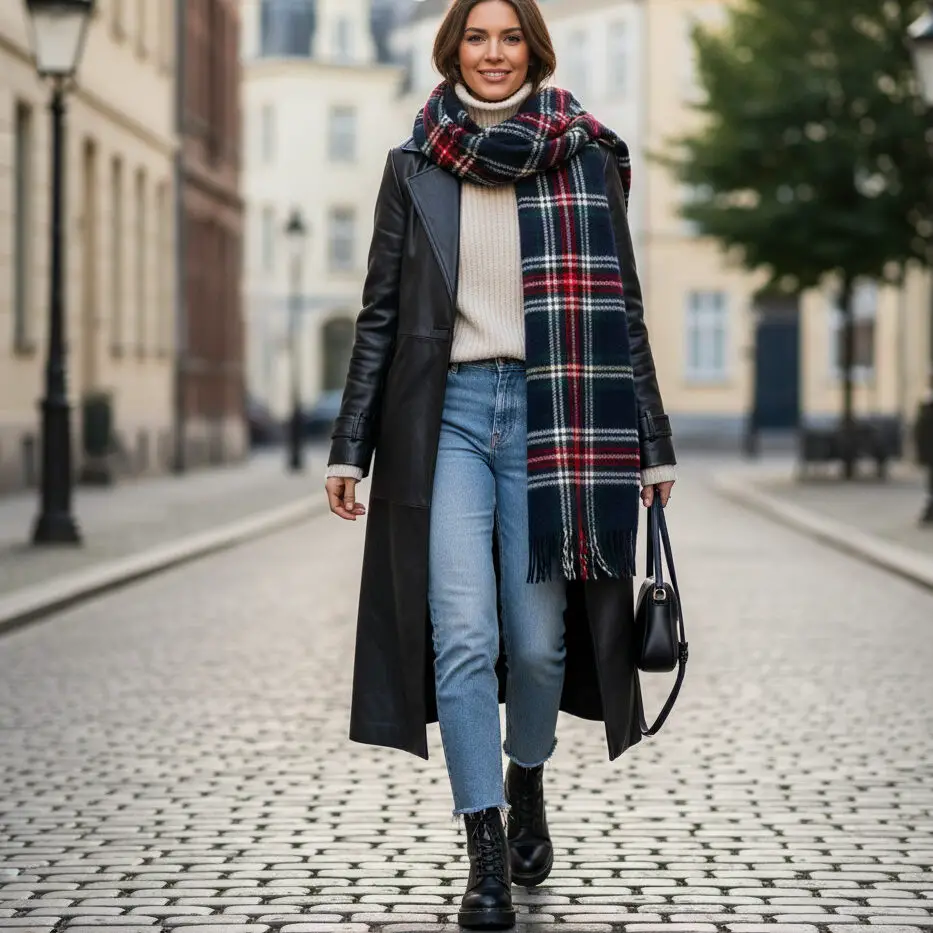 Try layering a chunky turtleneck and checkered scarf under your leather trench coat street style look. Straight jeans and lace-up boots seal the cozy-city aesthetic.