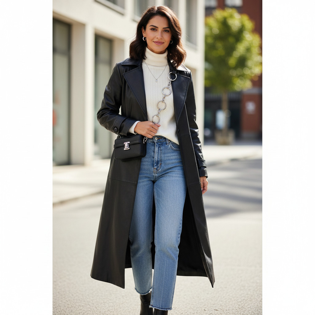 Pair a black leather trench coat with a white turtleneck, straight-leg jeans, and ankle boots. Add a mini crossbody bag and silver hoops for that effortless long black leather jacket outfit aesthetic.