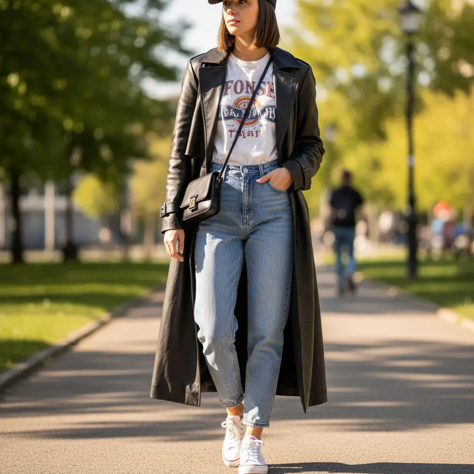 For off-duty charm, style a long leather jacket outfit with a graphic tee, mom jeans, and white sneakers. Throw on a baseball cap to finish your casual cool look.