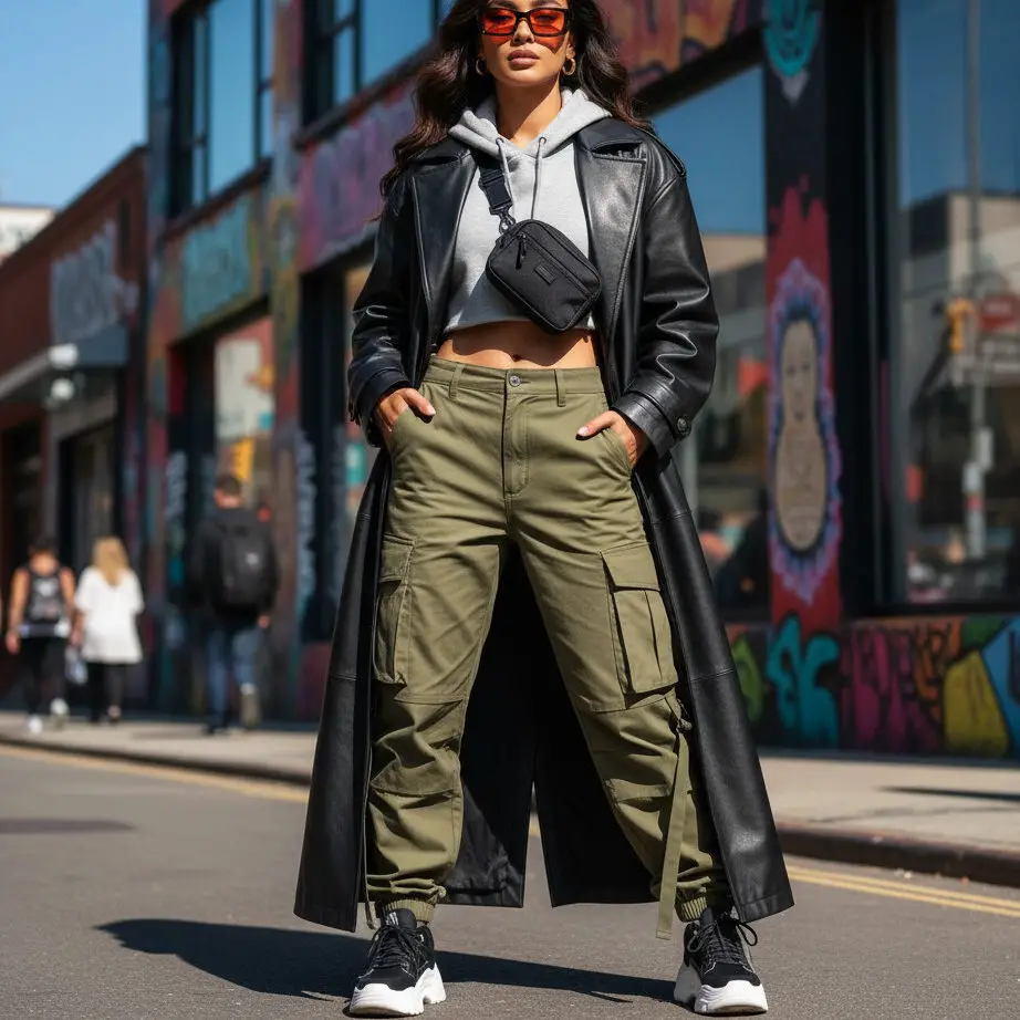 Go for an oversized long leather coat outfit with cargo pants, a cropped hoodie, and chunky sneakers. Finish the look with tinted glasses — pure leather trench coat street style energy.
