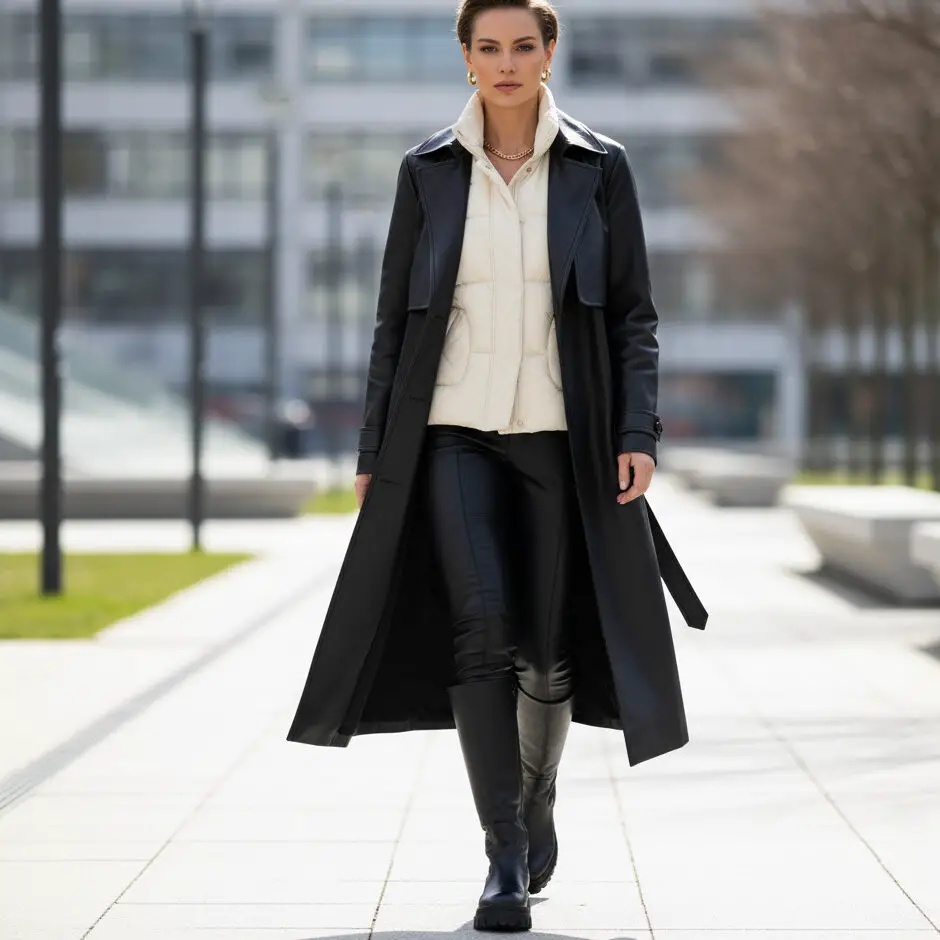 Layer your leather trench coat over a puffer vest outfit for contrast and dimension. Add leggings and knee boots — practical yet runway-ready.