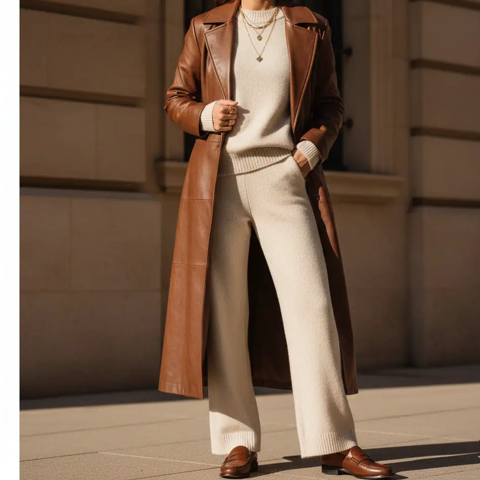 A brown leather coat outfit paired with a cream knit set and loafers feels warm and sophisticated. Add gold jewelry for a soft, polished finish.
