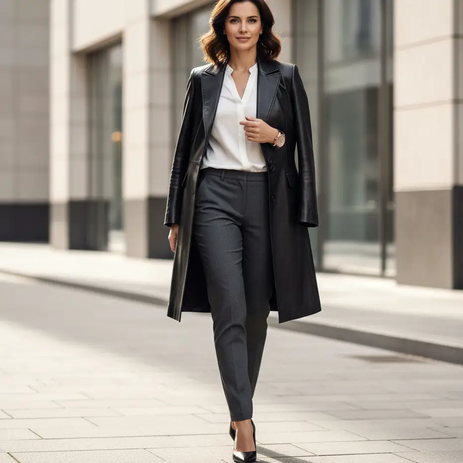Wear a tailored long black leather jacket outfit over a crisp white blouse and slim trousers. Add pointed heels and a statement watch for modern workwear appeal.
