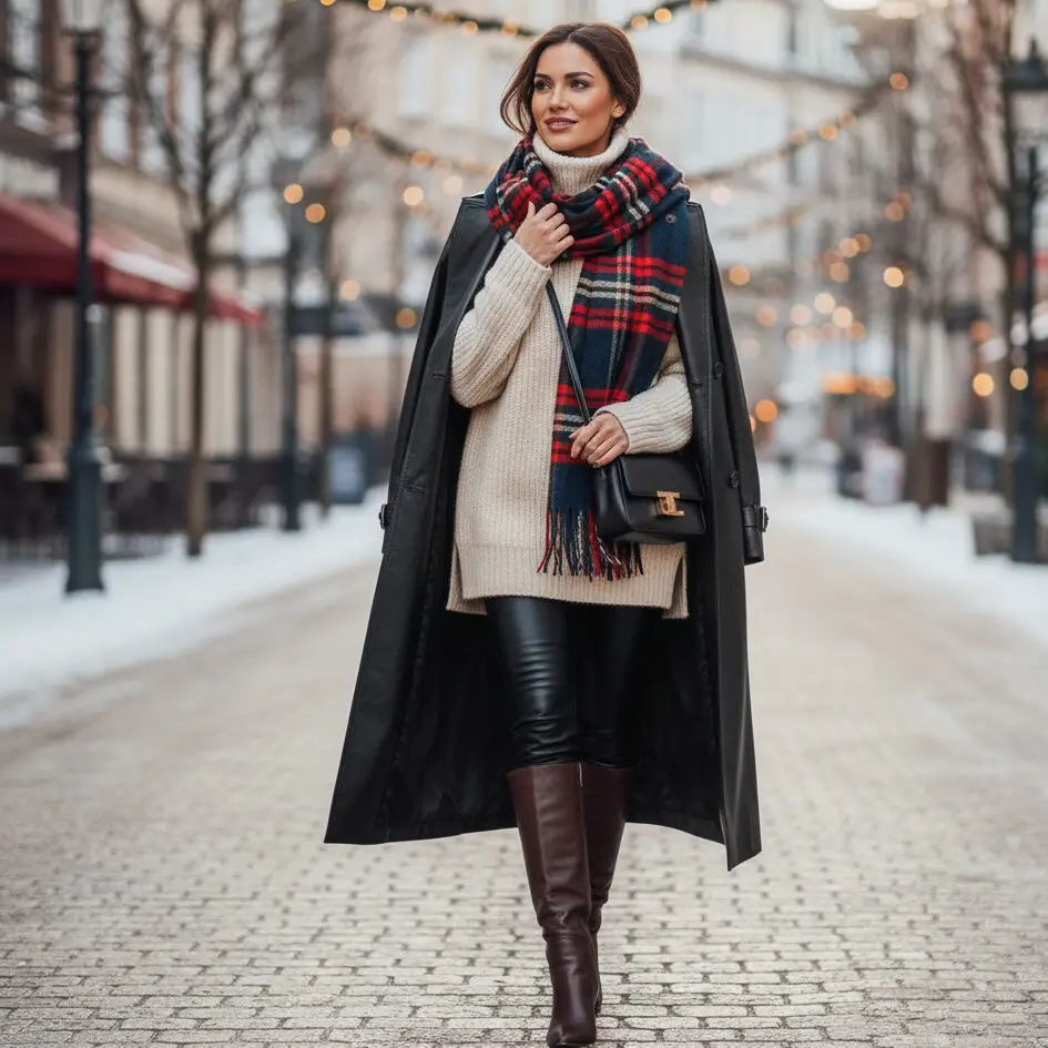 Rock your trench coat outfit winter look by layering a plaid scarf, knit sweater, and leather pants. Add heeled boots for warmth and polish — cozy yet sleek.