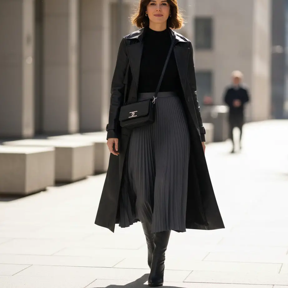 Wear your black leather coat outfit with a ribbed mock-neck top and pleated midi skirt. Finish with ankle boots and a crossbody bag — modern and versatile.
