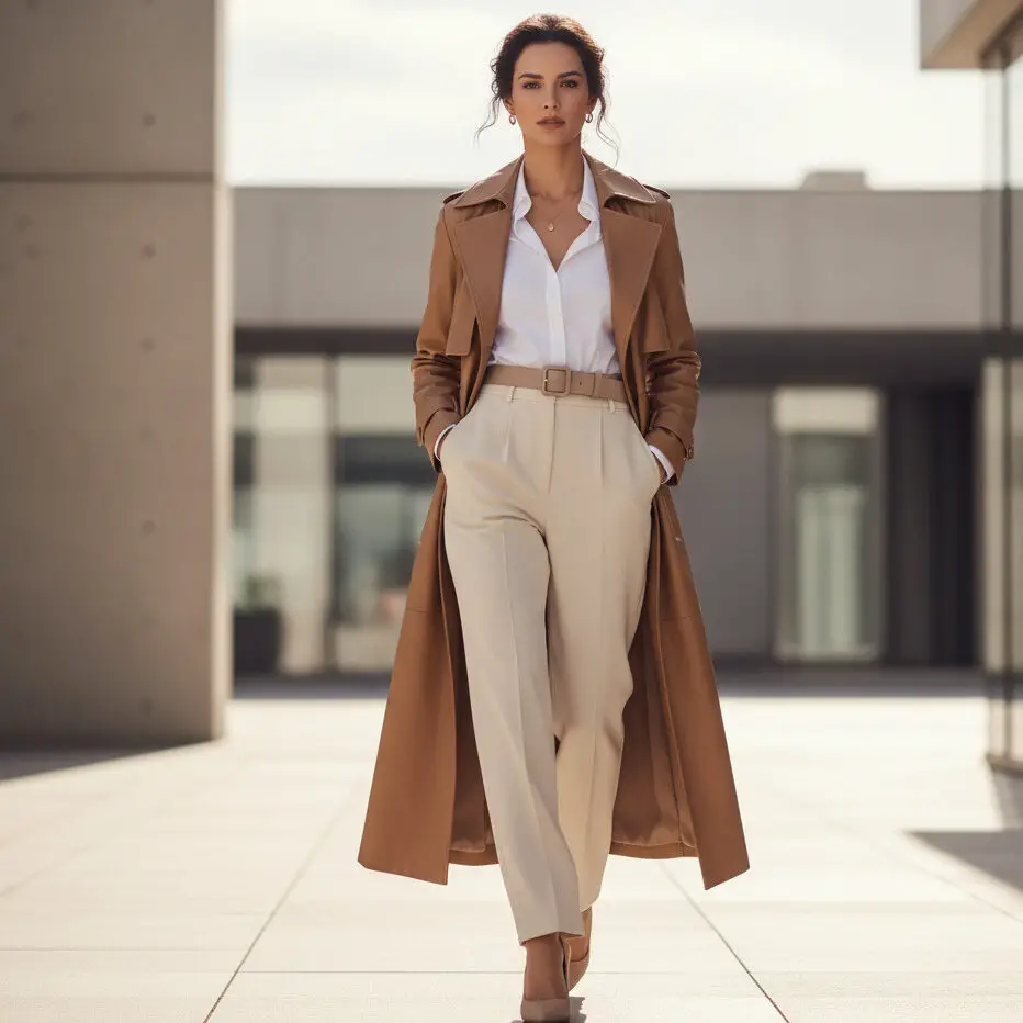 Style a long trench coat outfit in tan leather with cream trousers and a white button-up. Add a neutral belt and beige heels for understated elegance.