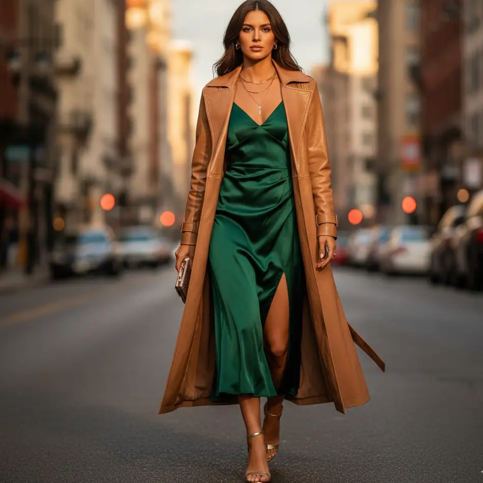 Slip a long trench coat outfit over a satin midi dress and strappy heels. The glossy texture of leather adds instant nighttime allure.
